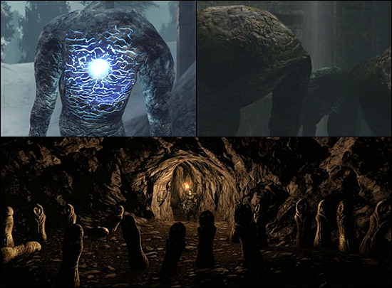 ※ 다크소울 2에 '거인'으로 묘사되는 얼굴에 구멍 뚫린 녀석들은 전작에 나온 로드란의 신족 거인들과는 명확히 다른 종으로 보인다. 그들은 좀 더 크고 단단한 몸을 갖고 있으며 문화도 전혀 다르다.