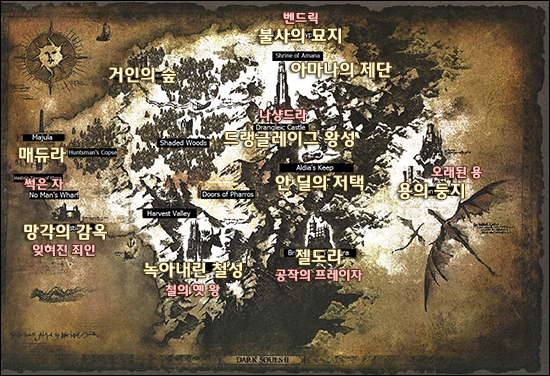"머나먼 북쪽 땅. 장벽 너머에, 위대한 왕의 이름 아래 부흥했던 오래된 왕국이 있다네. 당시의 이름이 아마 '드랭글레이그'였지? 이미 알고 있을 거야. 아니, 몰라도 상관은 없어. 자네가 원하든, 원치 않든 간에. 저 썩어문드러진 문에 도달하게 될테니. 그리고 불속으로 뛰어드는 나방마냥 스스로의 몸을 불태우게 될 게야. 몇 번이고, 몇 번 씩이고.. 저주받은 사람에게 허락되는 것은, 오로지 그것뿐이니까."