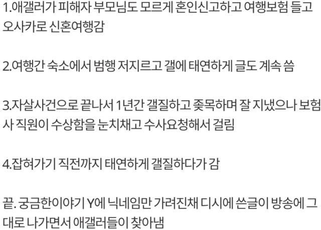 저놈이 개좆뱀인게 전여친도 저렇게 죽이려다가 들킨적있고 유독 가정환경 불우한 여자들한테 관심을 보임 여자가 무조건 자기한테 매달리게 잘해줘야한다 이런식으로 계획을 짬 죽이고 보험금 탈려고ㅇㅇ