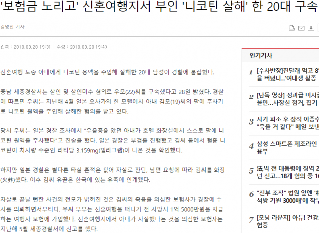 니코틴 원액을 이용해 김모(19)씨을 살인한 죄로 우모(22)씨가 구속됨