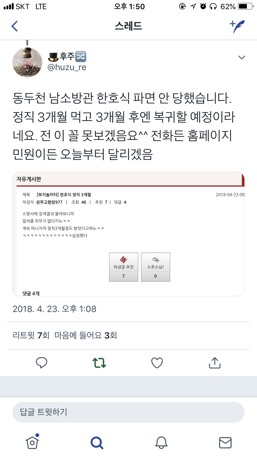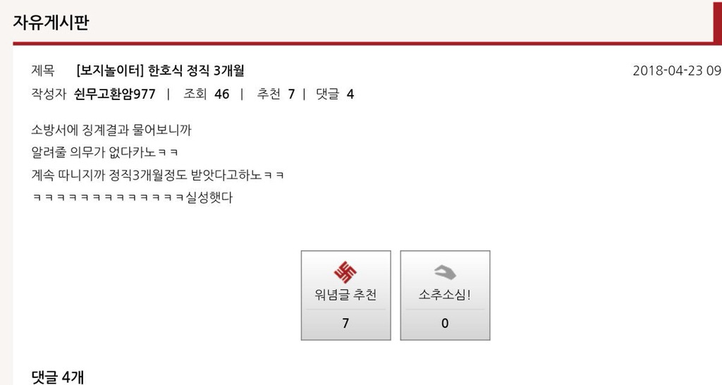 작성자아응앵에요 작성시간 18.04.23 복귘ㅋㅋㅋㅋㅋㅋㅋㅋㅋㅋㅋㅋㅋㅋㅋㅋㅋㅋㅋㅋㅋㅋㅋㅋ지랄나셧다 재기안하나 재기... 민원넣을거야지.. 저런 인성으로 무슨 인명을구조함? 되려 죽이는거 아님? 한호식은 재기하라