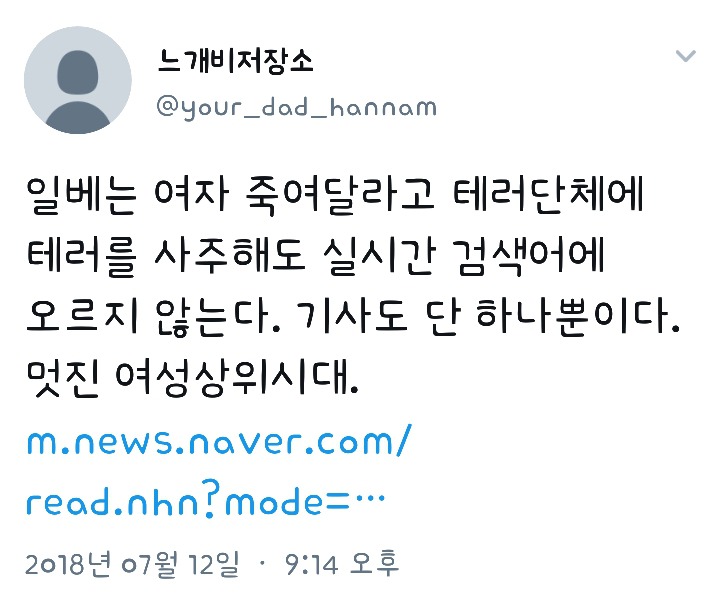 [씹빨쌔끼뜰]멋진 여성 상위시대.twt 작성자갓건베|작성시간18.07.12|조회수9,135 목록 댓글 20 글자크기 작게가 글자크기 크게가 출처 :https://twitter.com/your_dad_hannam/status/1017381636751495169?s=19 다음검색 현재 게시글 추가 기능 열기 북마크 공유하기 신고 센터로 신고 댓글 댓글 20 댓글쓰기 답글쓰기 댓글 리스트 작성자으르르꽝꽝 | 작성시간 18.07.12 놀고있네 작성자뭔데 뭔데에에에에엥~? | 작성시간 18.07.13 ㅋㅋㅋㅋㅋㅋㅋㅋㅋㅋ와 대단하다진중권이 남성권력이야기하면서 그렇다면 자기도 메갈이라 그랬을때 댓글로 다 한국여자 욕하던거 생각난다 반증의 장인들 아니냐 작성자매갈까스 | 작성시간 18.07.13 환멸나... 한남민국임ㅋㅋㅋㅅㅂ 작성자린생포기 | 작성시간 18.07.13 정말 환멸남 작성자성범죄자한남충죽어 | 작성시간 18.07.13 참.. 댓글 전체보기
