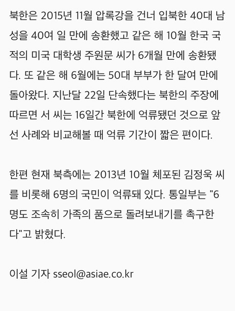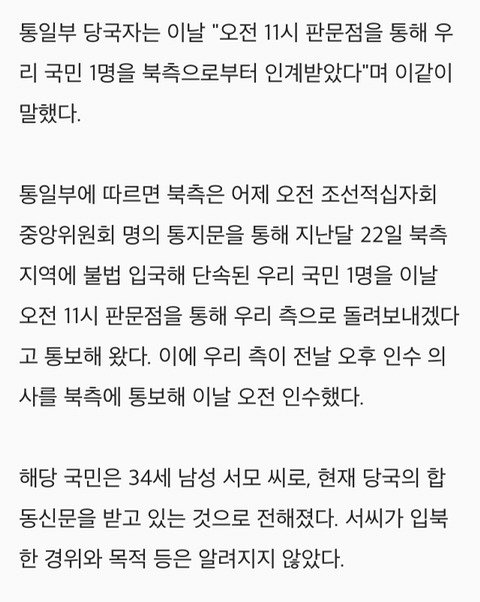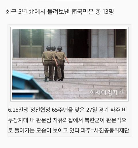 [여시뉴스데스크]北, 南국민 1명 판문점 통해 인계…"불법 입국해 단속" 작성자중복된 닉네임|작성시간18.08.07|조회수1,451 목록 댓글 2 글자크기 작게가 글자크기 크게가 출처 :http://www.asiae.co.kr/news/view.htm?idxno=2018080717321849380 다음검색 현재 게시글 추가 기능 열기 북마크 공유하기 신고 센터로 신고 댓글 댓글 2 댓글쓰기 답글쓰기 댓글 리스트 작성자연금복권 1등 당첨 소취 | 작성시간 18.08.07 월북한 이유가 도대체 뭐여 참 작성자감자전만드는중 | 작성시간 18.08.07 왜저러는거야 진짜 ;; 댓글 전체보기