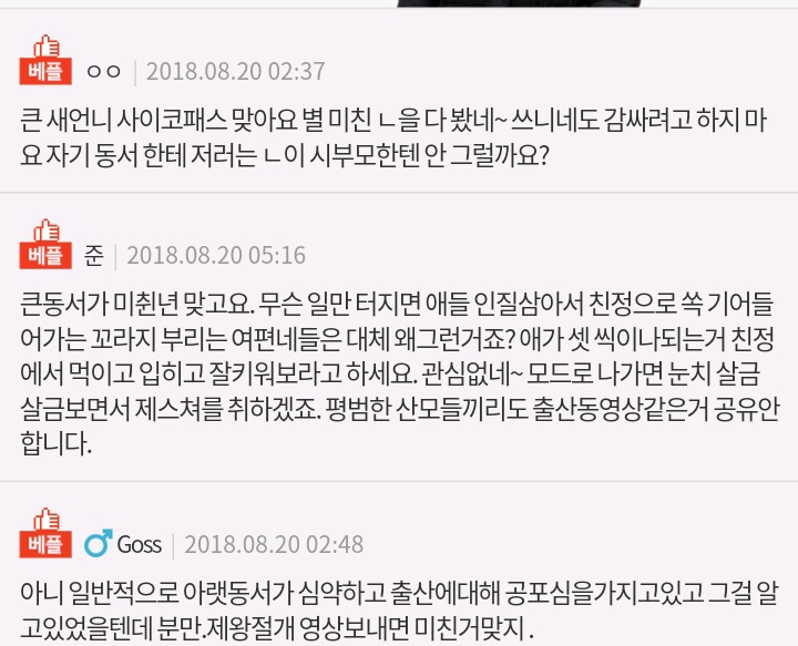 작성자곧추세우다 작성시간 18.08.21 애초에 아무리 빡대가리라도 저런짓 그냥 순수한마음이었음 저렇게 맘약한사람한테 굳이 그걸 왜보내진짜 미칝년이야그냥 뱃속에 애가없는것도아닌데 나도솔직히 임신중인데 무섭고두려워 우울하고 눈물나 시발아그냥 미친년이야 큰언니