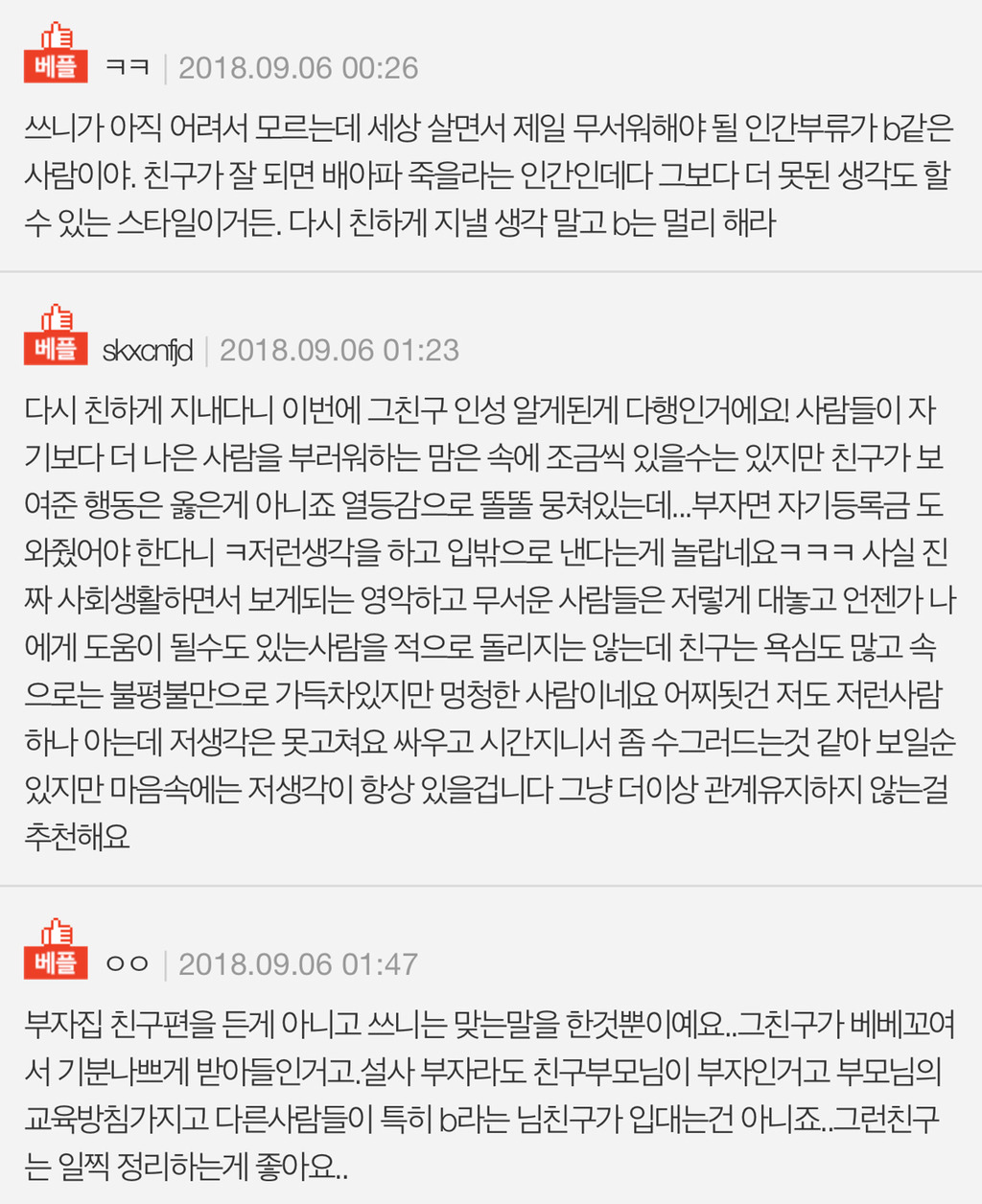 작성자New Born 작성시간 18.09.07 B 인성 뭔데;; 친구가 부자인거랑 지 등록금 힘든거랑 뭔상관인데;; 개꼬였다....