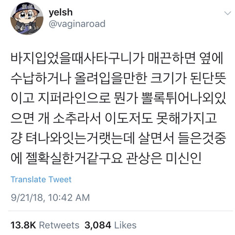 작성자이수만투르크 작성시간 18.09.24 내가 양남들 바지 입는거 봤음 한쪽으로 집어넣음