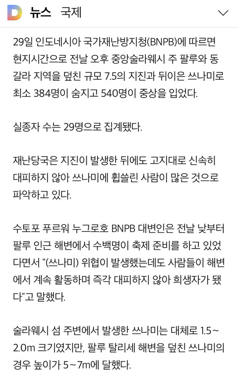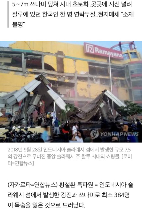 [여시뉴스데스크]인니 강진·쓰나미로 최소 384명 숨져.."수천명 사망 가능성"(종합2보) 작성자Originally|작성시간18.09.29|조회수21,225 목록 댓글 20 글자크기 작게가 글자크기 크게가 출처 : https://news.v.daum.net/v/20180929224502111?f=m인니 지금 심각하대.. 다음검색 현재 게시글 추가 기능 열기 북마크 공유하기 신고 센터로 신고 댓글 댓글 20 댓글쓰기 답글쓰기 댓글 리스트 작성자막댓사수 노간지 너희들 ㅗ | 작성시간 18.09.30 큰일이다 ㅠㅠㅠ 작성자릴리리랴히햐 | 작성시간 18.09.30 일본말고 인도네시아는 도와주고싶다 ㅠㅠ.. 모금같은거 하고싶다정말.. 작성자뽀 | 작성시간 18.09.30 어떡해ㅠ 작성자잉정밍 | 작성시간 18.09.30 어머 어떡해 작성자박효신(39) | 작성시간 18.09.30 헐시발무서워 댓글 전체보기