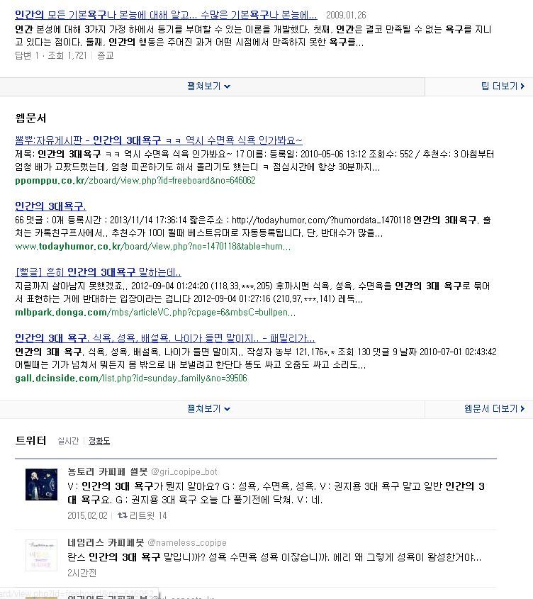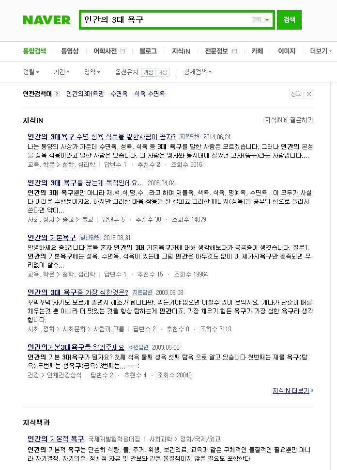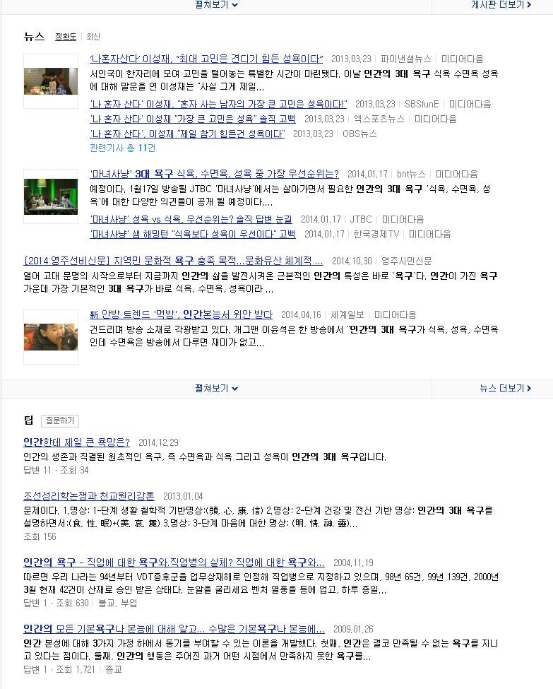 작성자불의는 정의를 이길 수 없다 작성시간 18.09.30 나는 생존에필수적인 기준으로 3대 욕구면 식욕, 수면욕, 배설욕이라고 생각