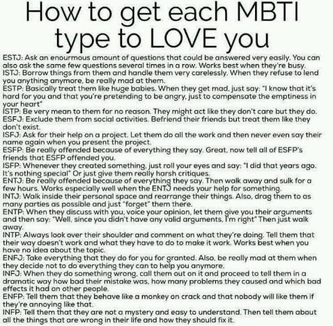 우선 infp한테 가서 "니가 무슨 생각을 하는지 다 티 난다. 뭐 근데 특별할 것도 없네."라고 한다. 그리고 나선 걔들이 소중하게 여기는 거나 걔들이 살아온 인생 자체를 들먹이면서 처음부터 글러먹었거나 무의미하다고 해주자.