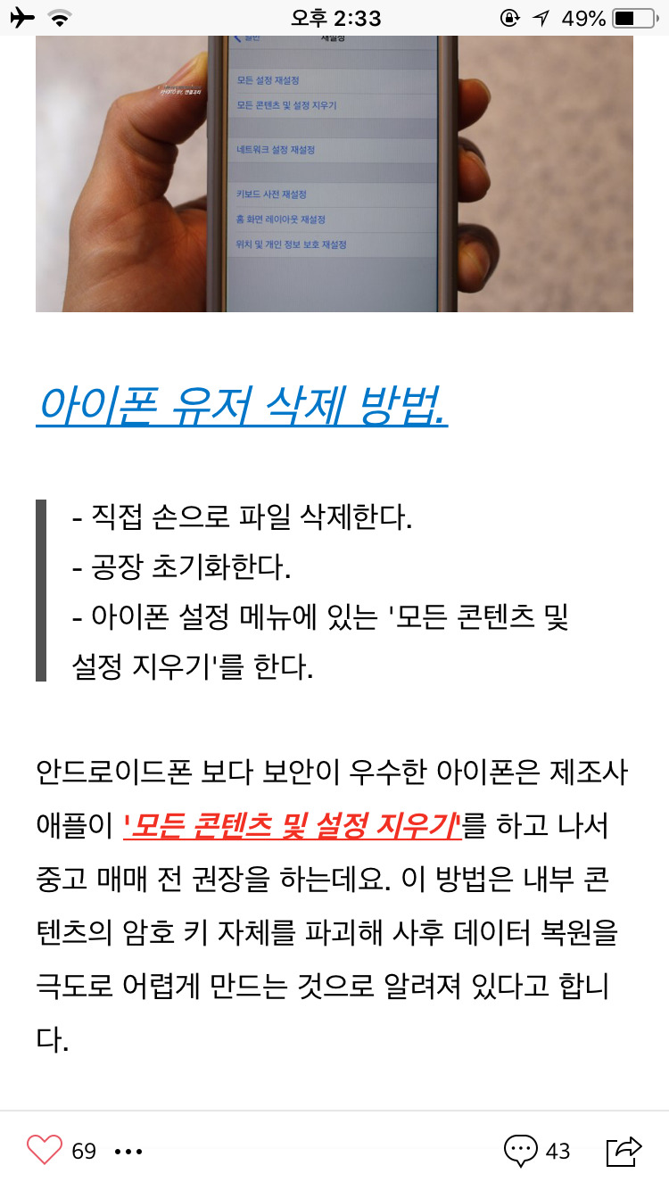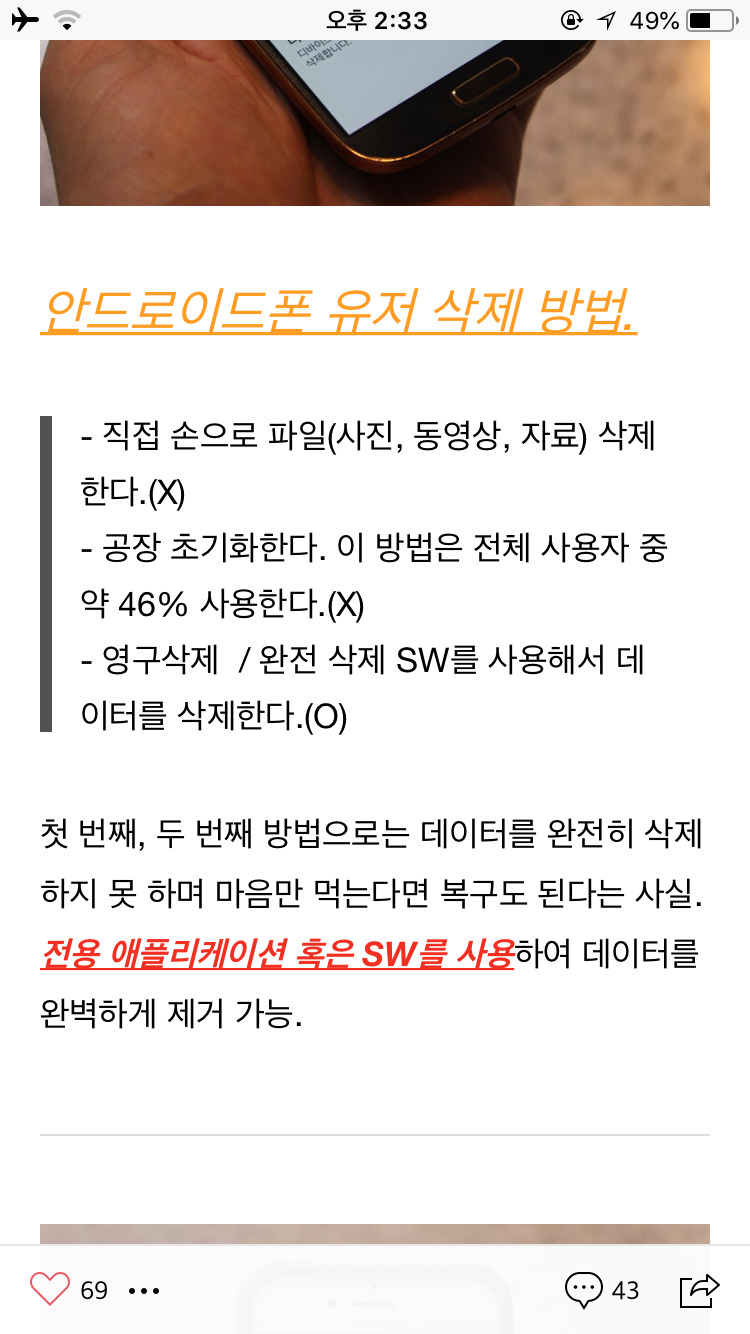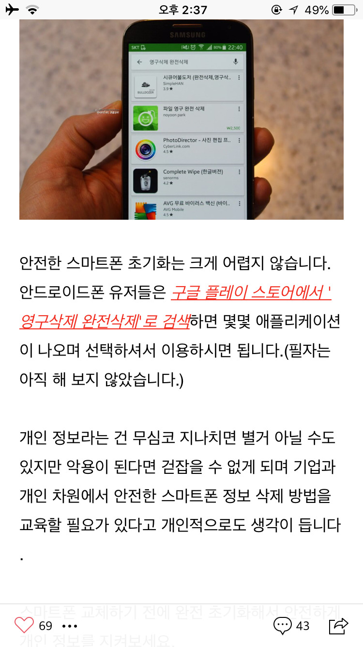 작성자장전중 작성시간 18.10.17 나 좀 의심충이라서 안드 데이터 지워준다는 앱.... 과연 제대로 지우는걸까부터 해서 지우는척 데이터빼가는 건 아니겠지 의심돼서 절대 못씀... 폰은 그냥 중고거래보다는 물리적으로 뽀각뽀각해서 버리는게 나은거같아