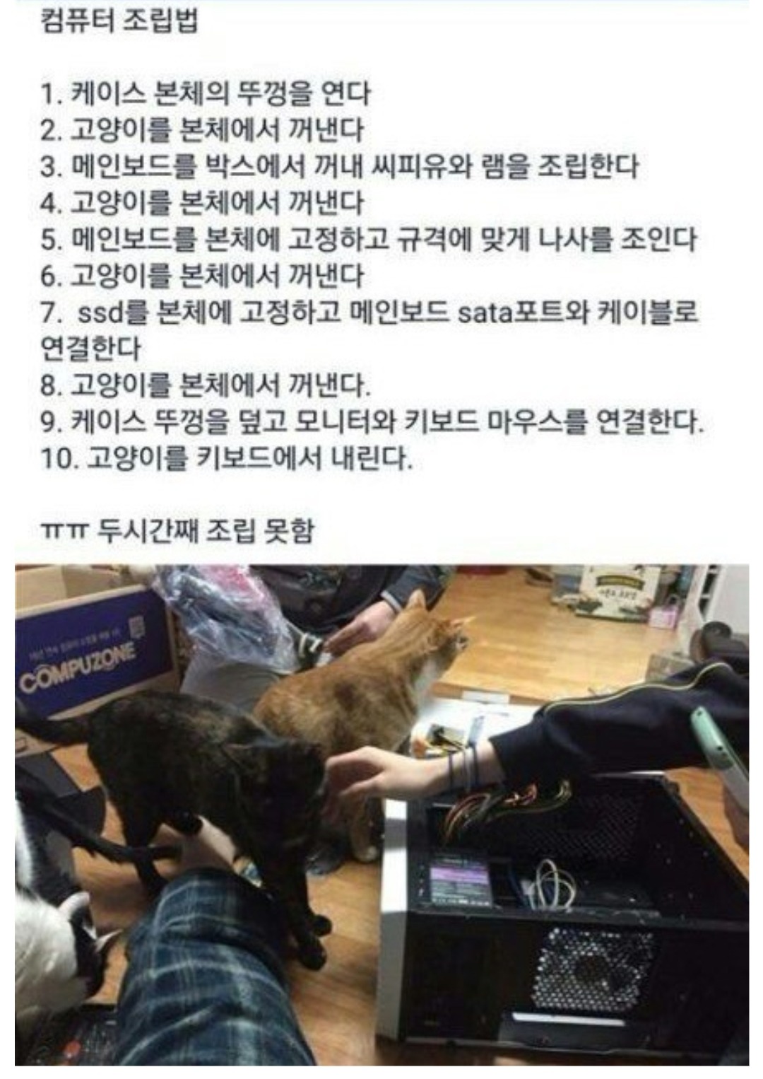 [흥미돋]고양이 집사들의 컴퓨터 조립 방법 작성자밤비밤비야|작성시간18.10.19|조회수43,227 목록 댓글 13 글자크기 작게가 글자크기 크게가 출처 : 여성시대 밤비밤비야ㅋㅋㅋㅋㅋㅋㅋㅋ 계속 고양이 꺼내야함... 다음검색 현재 게시글 추가 기능 열기 북마크 공유하기 신고 센터로 신고 댓글 댓글 13 댓글쓰기 답글쓰기 댓글 리스트 작성자먹끼 | 작성시간 18.10.19 누워서 주무시는데요 ㅠ 이미지 확대 답댓글 작성자먹끼 | 작성시간 18.10.19 끄으으응응으끙끙 키보드 아이리버껀데 하이마트에서 세일하길래 샀어 ㅎㅎ 작성자약오르지깎꿍 | 작성시간 18.10.19 고양이 집사의 퍼즐맞추는 방법1. 퍼즐을 펼친다2. 고양이 발을 치운다3. 퍼즐을 그림과 대조해 맞춘다4. 고양이 발을 치운다5. 퍼즐이 모자란다6. 고양이가 숨겨둔 퍼즐을찾는다7. 퍼즐을 완성한다 이미지 확대 작성자냐옹마옹 | 작성시간 18.10.19 다요리도못씀,,ㅋ 이미지 확대 답댓글 작성자난짱ㅋ | 작성시간 18.10.20 ㅜㅜㅜㅜㅜㅜ기여워ㅜㅜㅜ 댓글 전체보기