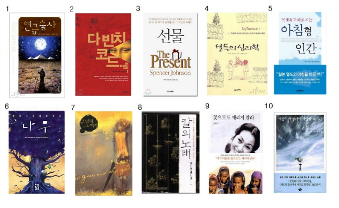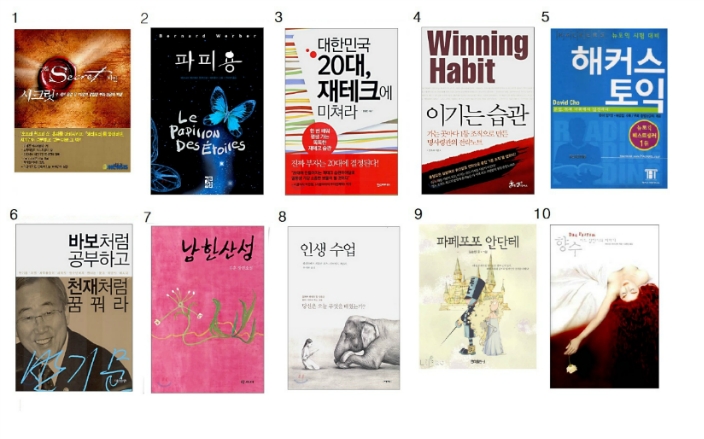 | 1 | 연금술사/ 파울로 코엘료 | 11 | 10년후 한국/ 공병호 |