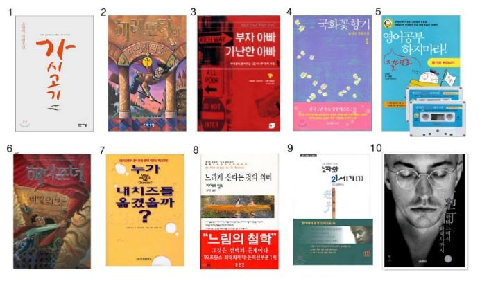 | 2 | 해리포터와 마법사의 돌1/조앤 K.롤링 | 12 | 상실의 시대/ 무라카미 하루키 |