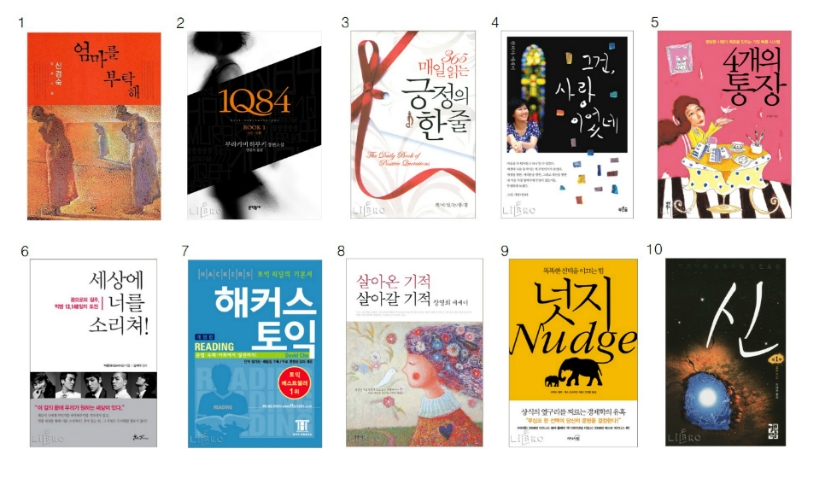 | 4 | 아프니까 청춘이다 / 김난도 | 14 | 천사의 부름 / 기욤 뮈소 |