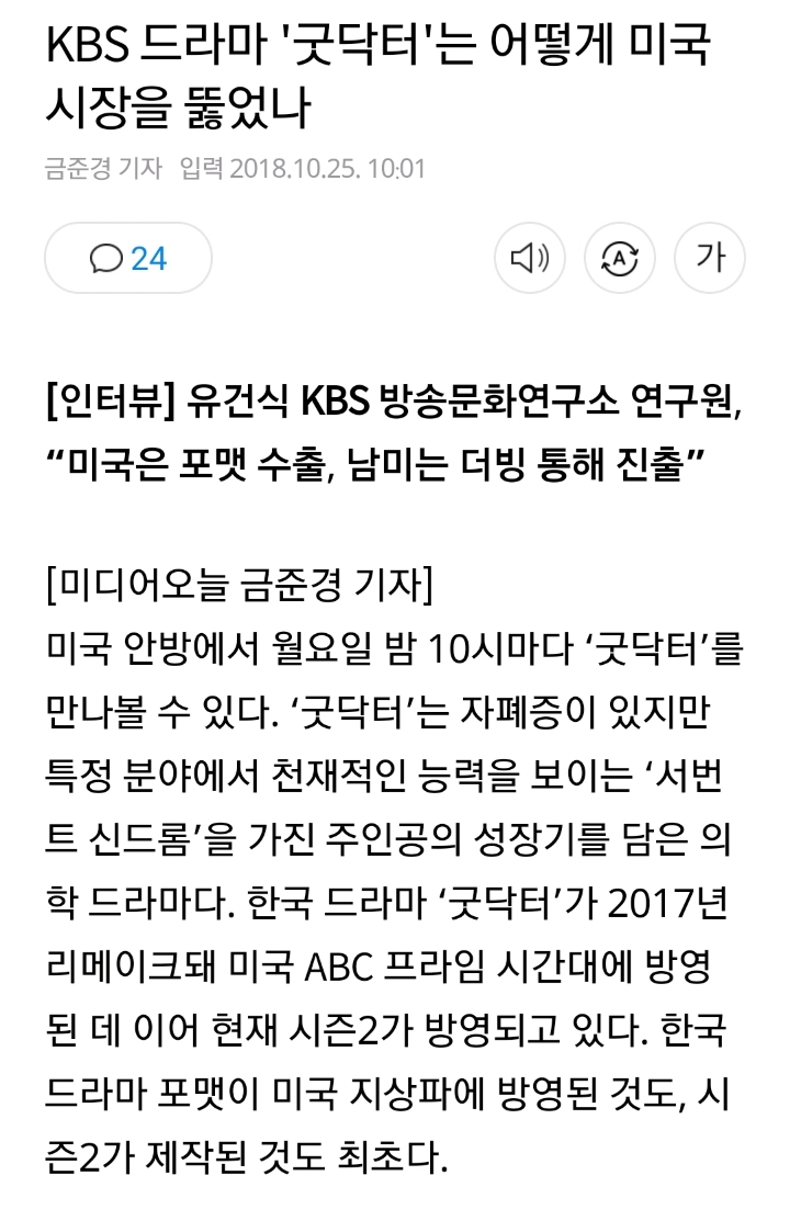 작성자정예인 작성시간 18.10.25 한드로만 봤는데 굿닥터 재밌었으 주원 연기 개잘해씀 상상씬 존나 아련터져ㅠㅠ