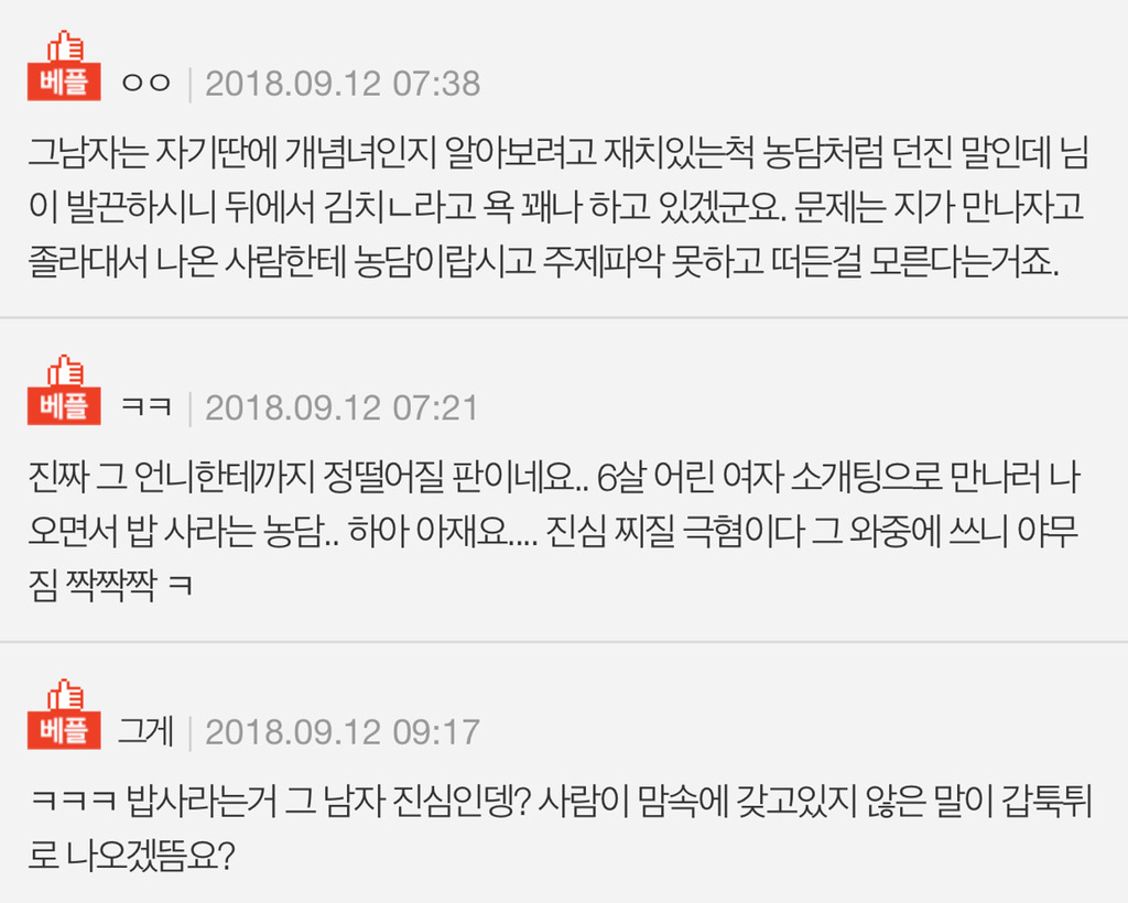 진짜 장난이라고 치더라도 기분이 너무나쁘고 어이도없고 이성의 끈이 끊어지는느낌이라 죄송한데 너무제스타일이아니라서 도저히 못보겠다고, 연락안하셨음좋겠다 자꾸연락하시면 차단하겠다했더니 장난인데 밥사라그래서 그러는거냐고