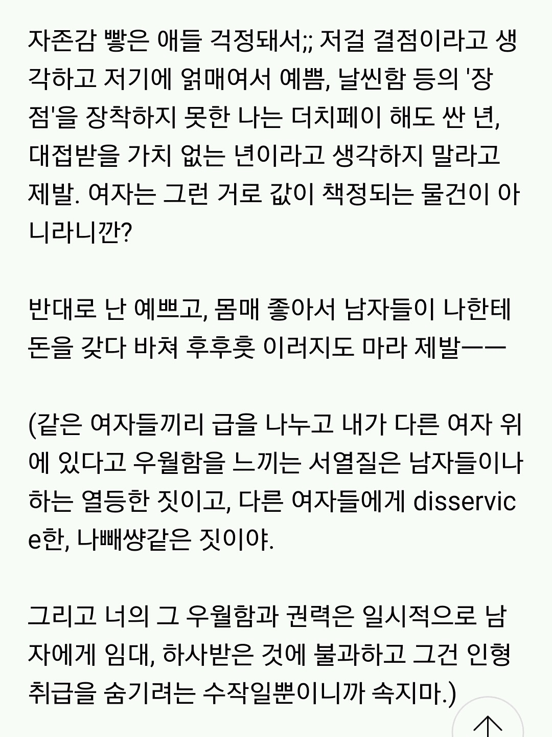 이 글에서 말하듯 애초에 타인은 결코 내 가치를 함부로 매길수없고, 여자는 남자의 평가로 가치가 책정되는 물건이 아닌 있는 그대로 가치있는 인격체야