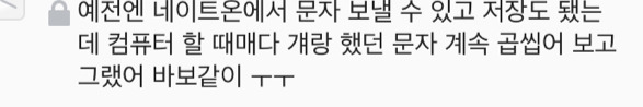 예전엔 네이트온에서 문자 보낼 수 있고 저장도 됐는데 컴퓨터 할 때마다 걔랑 했던 문자 계속 곱씹어 보고 그랬어 바보같이ㅜㅜ