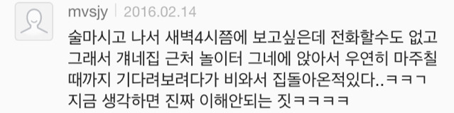 우연히 만났던 장소에서 혹시나 또 마주칠까봐 일부러 먼 길 돌아서 그 쪽 지나서 집에 오는거 ㅠㅠ(애잔)..