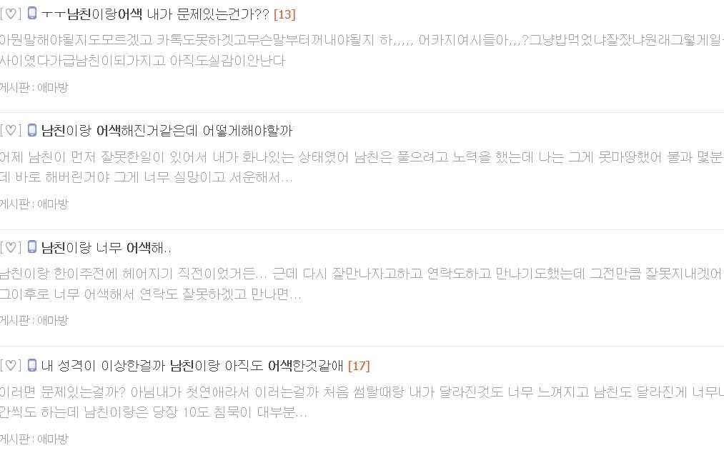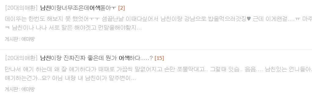 작성자가계부쓰는중 작성시간 19.01.08 근데 잠자리 가져도 사람 자체가 어색하면 걍 어색함; 이전보다 좀 더 나아질뿐이지 엄청 갑자기 가까워지진 않더라....