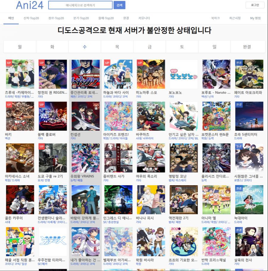 애니24 어제부터 계속 디도스 공격으로 불안정한 상태