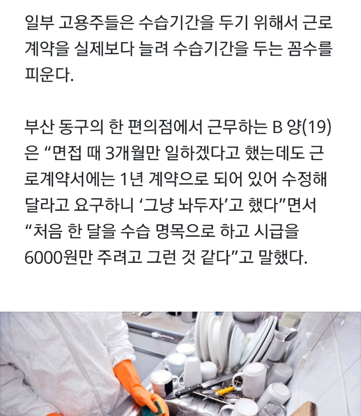 작성시간 19.01.21 솔직히 어떤 일이든 처음하면 수습기간 필요함.. 적응도 안되어 있고 잘 모르니까 필요하긴 한데, 요는 너무 과하거나, 시급을 제대로 안주니까 문제인듯..