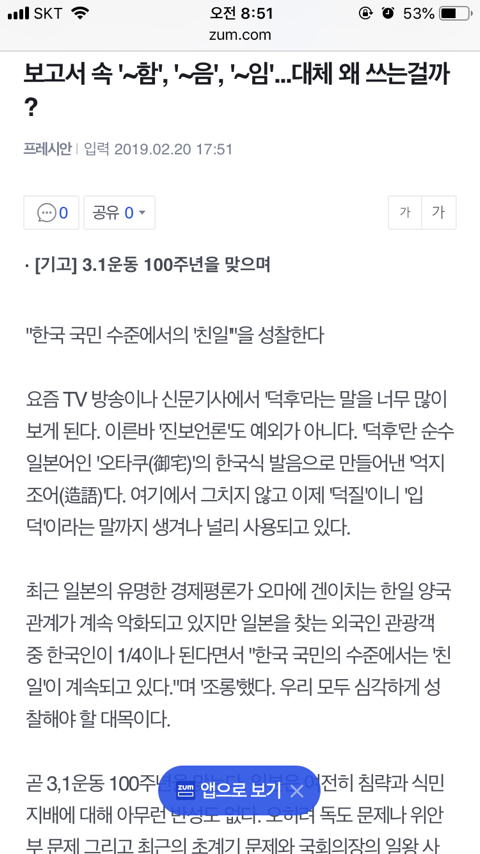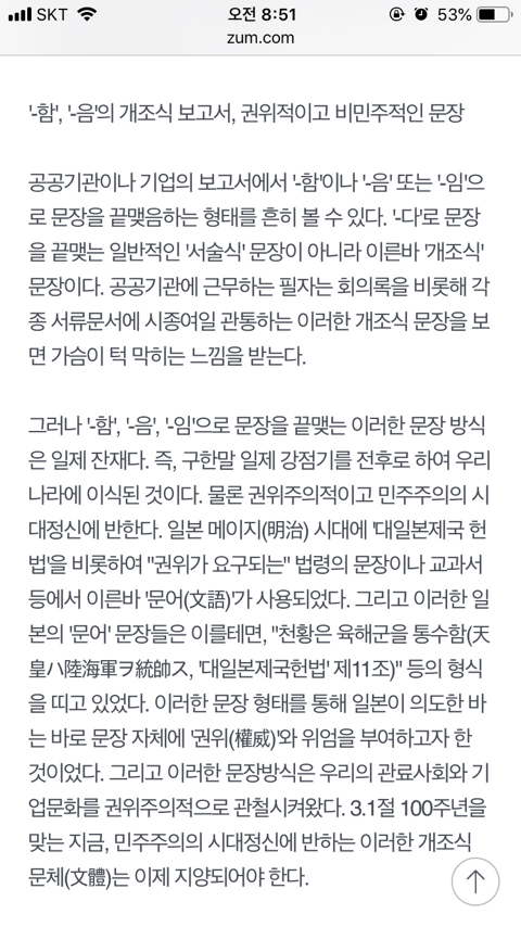 [여시뉴스데스크]보고서 속 '~함', '~음', '~임'...대체 왜 쓰는걸까? 작성자몽몽eee|작성시간19.02.21|조회수46,903 목록 댓글 38 글자크기 작게가 글자크기 크게가 출처 : http://m.zum.com/news/society/50723878중략중략음슴체가 일제 잔재라니... 다음검색 현재 게시글 추가 기능 열기 북마크 공유하기 신고 센터로 신고 댓글 댓글 38 댓글쓰기 답글쓰기 댓글 리스트 작성자우리집가오니 | 작성시간 19.02.21 안써야지ㅜㅜ 보고서에야 안쓰지만 ㅜㅜ 작성자뽀 | 작성시간 19.02.21 헐.. 작성자ㅇwㅇ/ | 작성시간 19.02.21 으으.. 작성자영앤리치남친소취요 | 작성시간 19.02.21 할 일본 잔재였더니 당장 고쳐야지 작성자넌좀조용해줄래 | 작성시간 19.02.24 음..아에옴.. 댓글 전체보기
