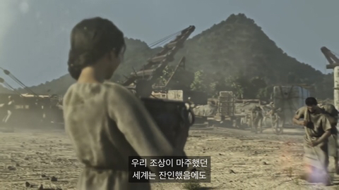 어두운 분위기에 군인들이 발맞춰 행진하고