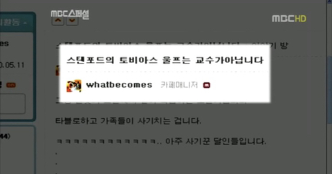 왓비컴즈는 타진요 카페에 울프는 진짜 교수가 아니라고 글 씀