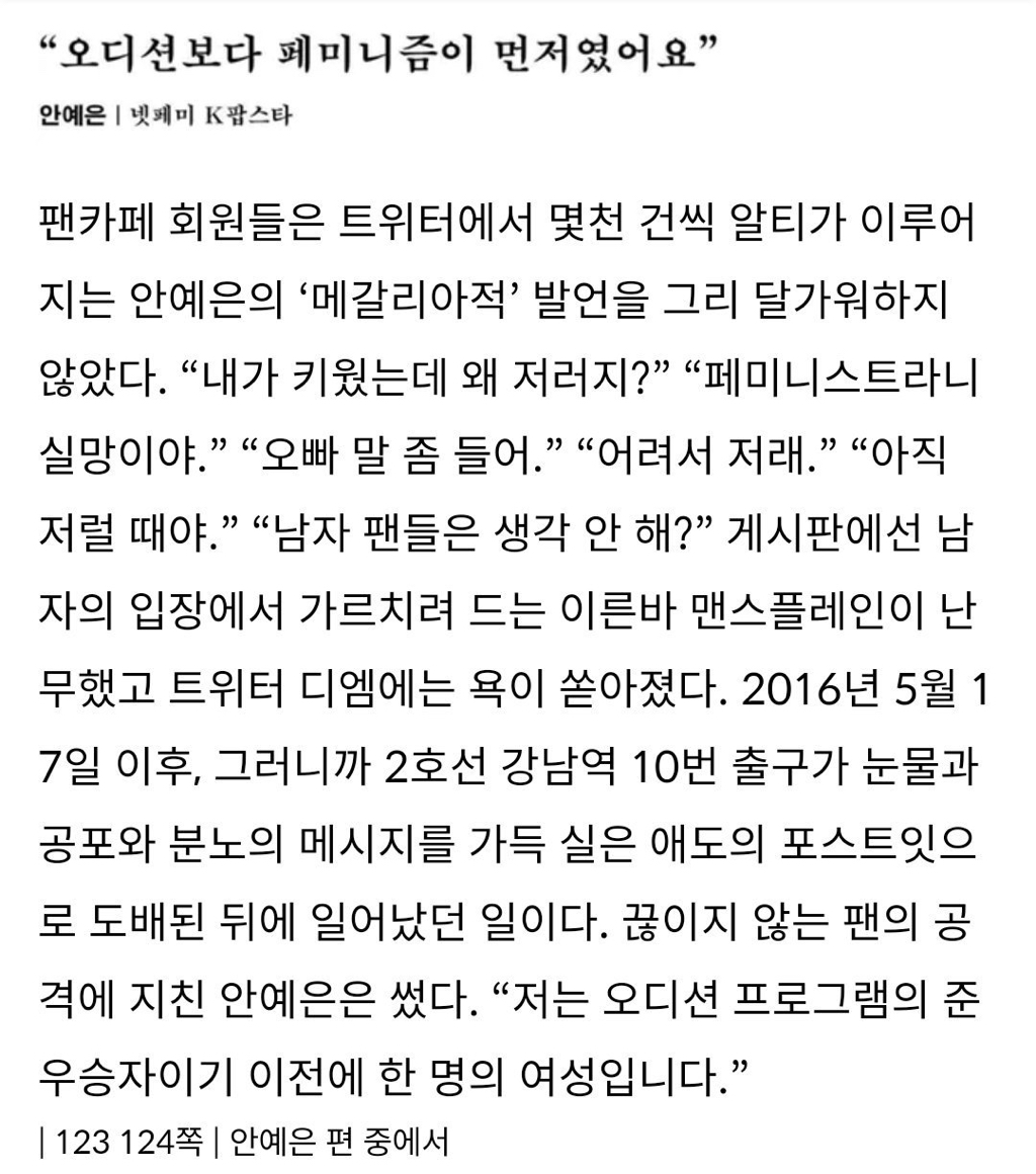 "한국 사회가 나를 페미니스트로 만들었다. 대학 내내 페미니즘 동아리, 여성운동하는 선배들을 피해 다녔다. 하지만 대한민국에서 살아가면서 이 사회가 나를 페미니스로 만들었다.