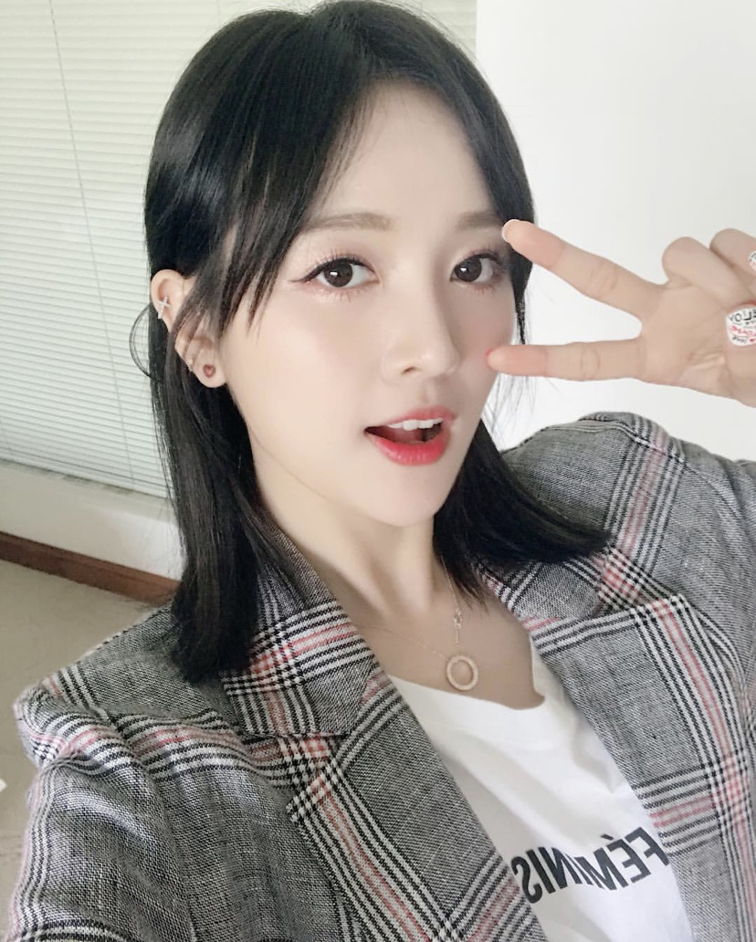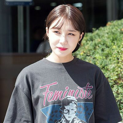 우주소녀 선의는 être féminist 라고 적힌 티셔츠를 입음