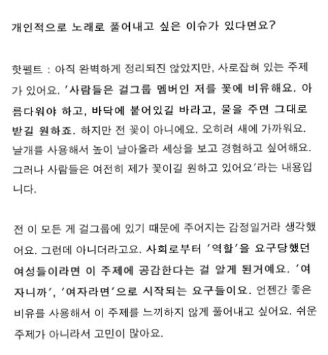 "내 이름을 검색하면 몸매, 얼굴 등 외적인 모습에 대한 평가들이 나오지만, 핫펠트를 검색하면 나에 대한 음악이 99%로 나온다. 핫펠트 몸매가 어떻네 이런 글은 별로 없다.