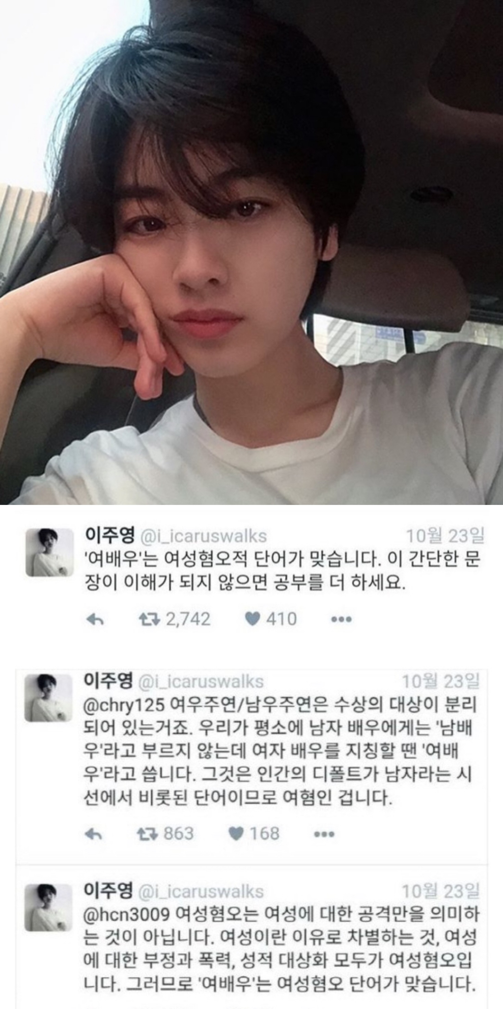 “여배우는 여성혐오적 단어가 맞다. 이 간단한 문장이 이해되지 않으면 공부를 더 하라. 우리는 평소에 남자배우는 남배우라고 부르지 않지만 여자배우는 여배우라고 부른다.