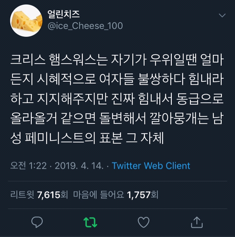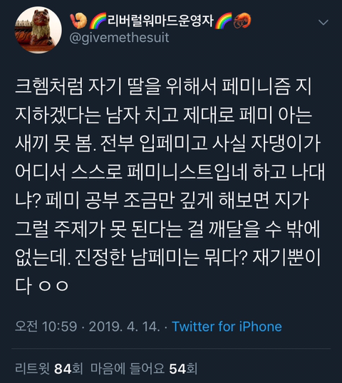 작성자김독자 작성시간 19.04.18 이래서 남페미들은 지들 페미예요 이럴 시간에 남자나 패서 행동으로 보여야 함. 입장 표명 진짜 의미없어