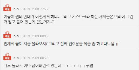작성자개싫어 작성시간 19.05.26 아니근데 목줄 안하고더니는거 진짜 개오바...