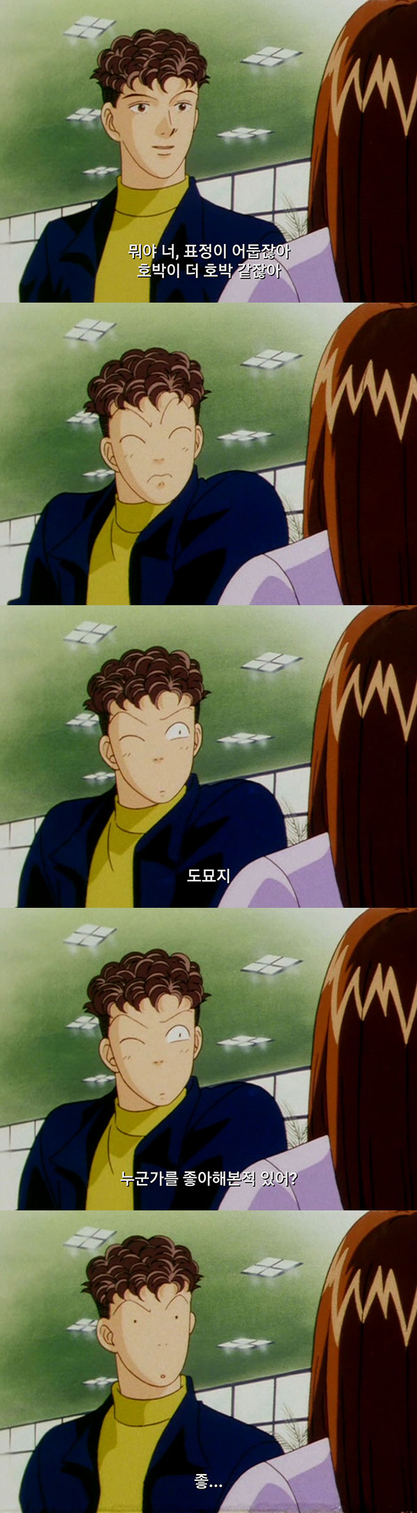 츠쿠시한테 시비걸어놓고 한소리 들을까봐 미리 눈 질끈 감았는데 다른 말이 돌아오니까 이상한 표정이 되는 도묘지