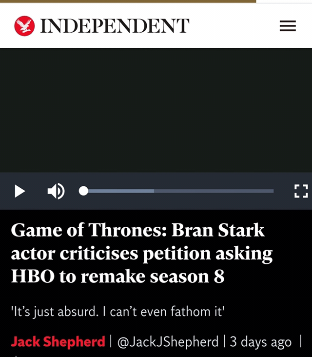 "이 모든 청원같은 것들은 지난 10년 넘게, 그리고 마지막 시즌을 위해 11개월 동안 쉬지 않고 달려온 배우들과 작가들, 그리고 제작자들에게 무례한 것이라고 생각한다