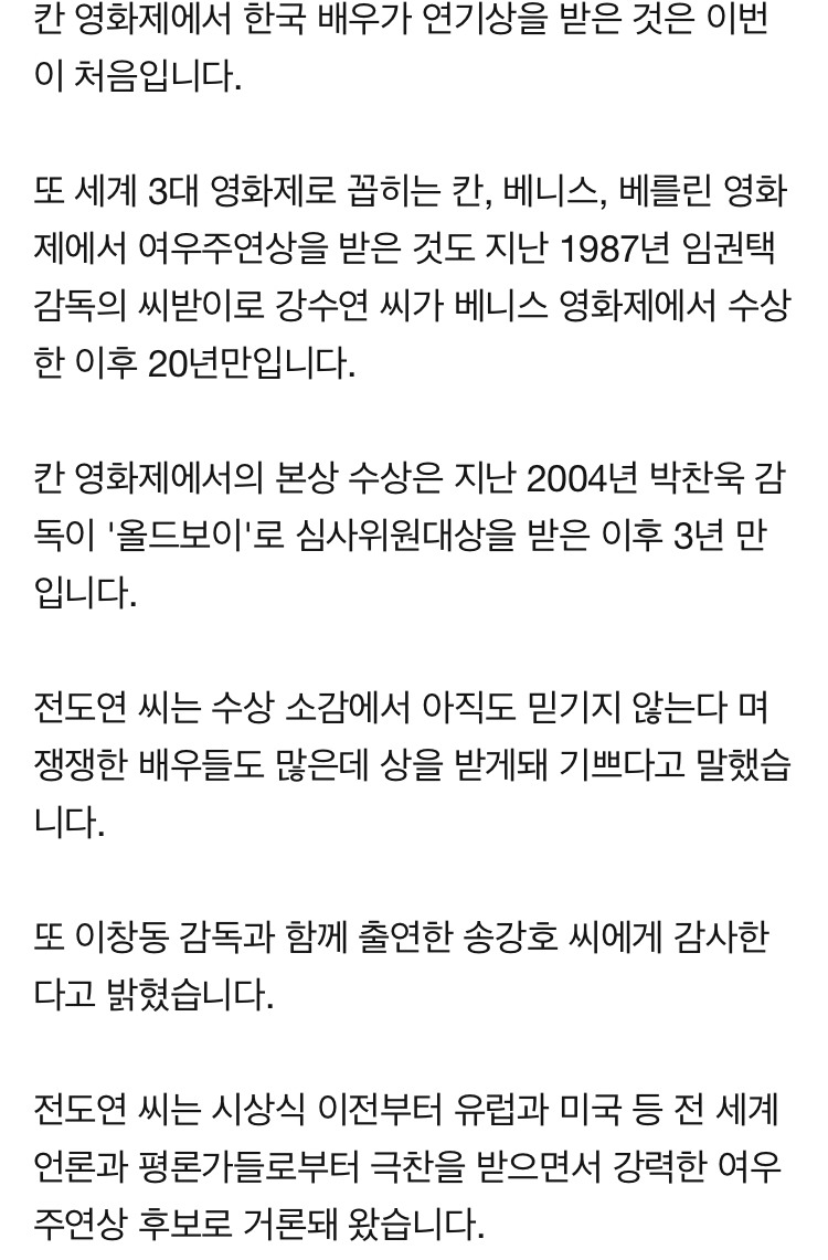 [여시뉴스데스크]전도연 씨, 칸영화제 여우주연상 수상[옛날기사] 작성자张彬彬|작성시간19.05.24|조회수2,079 목록 댓글 3 글자크기 작게가 글자크기 크게가 출처 : http://naver.me/5Gxil1HF12년전 이맘때쯤 전도연 배우의 칸 영화제 여우주연상 수상으로 화제 됐던 거 생각나서 가져옴..!!! 다음검색 현재 게시글 추가 기능 열기 북마크 공유하기 신고 센터로 신고 댓글 댓글 3 댓글쓰기 답글쓰기 댓글 리스트 작성자똥빤스 | 작성시간 19.05.24 우와아 작성자별도 요청 : “너” | 작성시간 19.05.24 밀양은 진짜 최고야 작성자오딘은딘딘 | 작성시간 19.05.24 전도연 연기 진짜 존나 잘해.... 댓글 전체보기