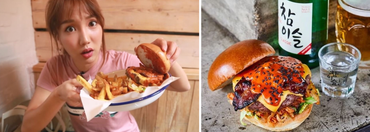 유튜버 국가비가 김치 버거를 소개하고 있다.
