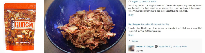 출처 : 아마존 캡처, 'what's good in trader's joe' 블로그‘트레이더 조에는 뭐가 좋지?(What’s Good at Trader Joe’s?)’ 라는 사이트를 운영하는 한 외국인은 자세한 감상을 남겼다. 블로거는 먼저 “김치는 무섭다. 발효했고 양배추기 때문이다”라고 포스팅을 시작했다. 그는 케일칩을 상상하면서 김치칩을 구매했다고 한다. 그러나 치즈에 절여진 맛있는 케일칩과는 맛이 전혀 달랐다고 평가했다. “썩은 양배추에서 나는 시큼한 맛이 났다”면서 “양배추 속에는 발효과정에서 시큼한 맛을 내는 수백만 개의 박테리아가 살아있는 것 같다”고 묘사했다.