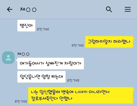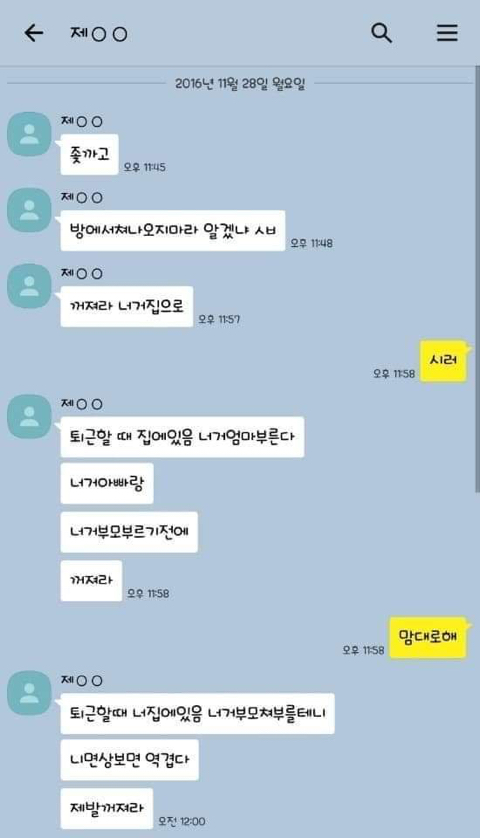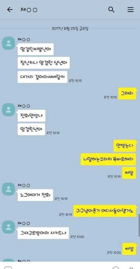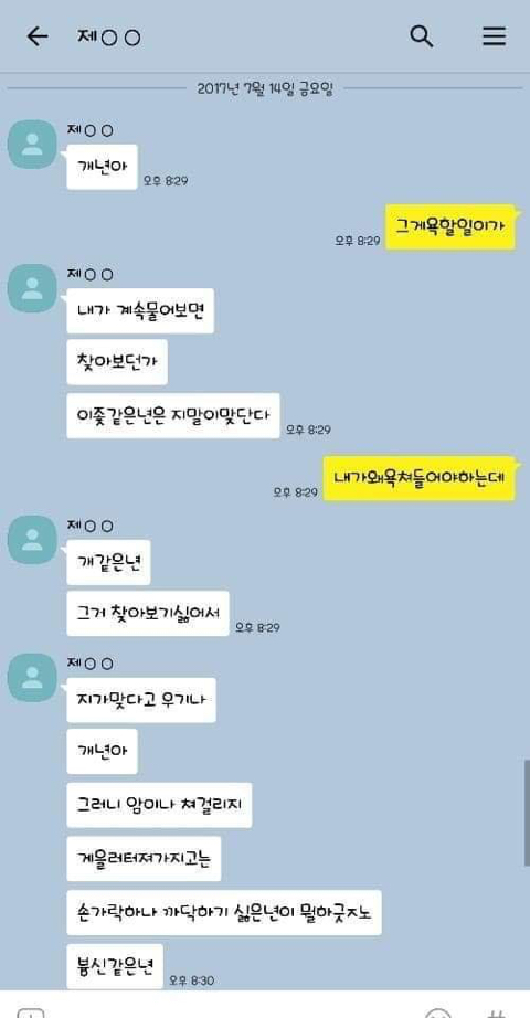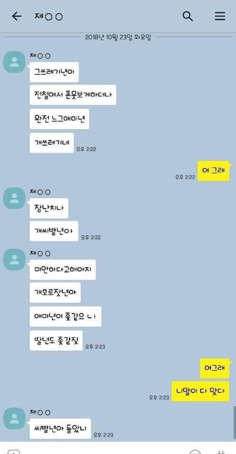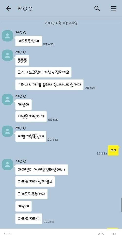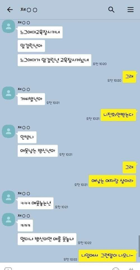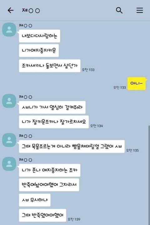 작성자엄마,쟤흙먹어 작성시간 19.06.21 손발톱 하나씩 다 뽑고 몸 전체를 회떠서 사형시켜야한다 저게 사람새끼냐? 카톡으로 저 정도면 실제 면대 면으론 어땠겠어 소름돋고 무섭다 진짜