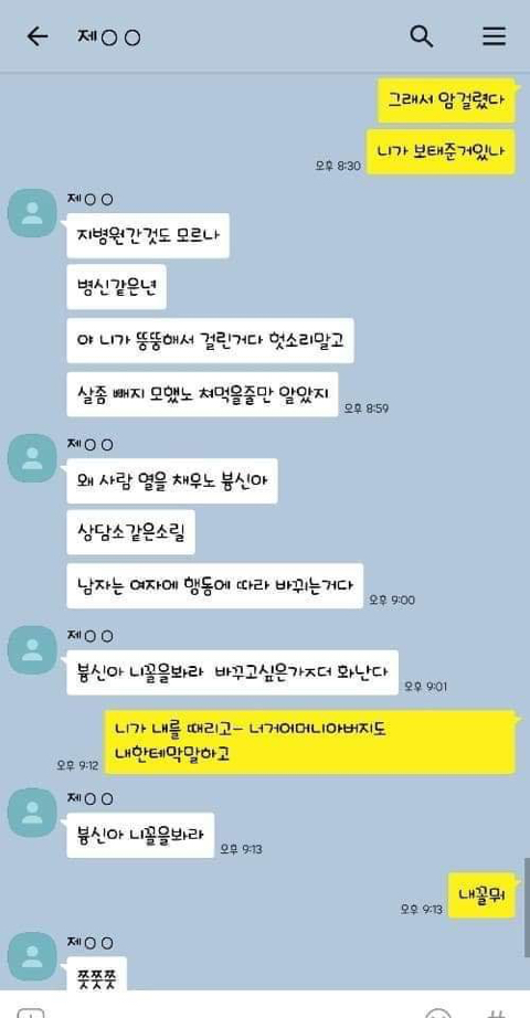 작성자내꺼야!!! 작성시간 19.06.24 미친새끼 교통사고나서 식물인간됐으면!!!정신멀쩡한데 식물인간 돼버렸음좋겠다