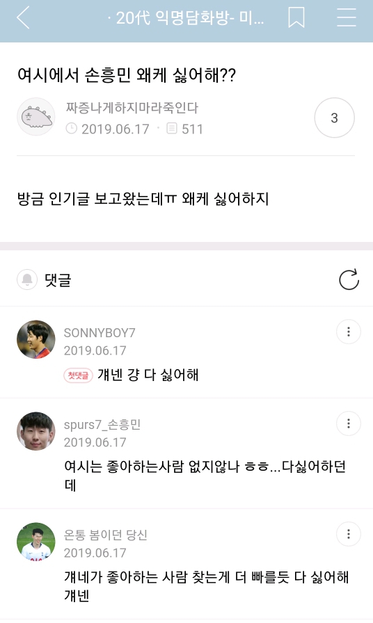 작성자한남 존나 싫어 개극혐 작성시간 19.06.29 zzㅋㅋㅋㅋㅋㅋㅋㅋㅋㅋㅋㅋㅋㅋㅋㅋㅋㅋㅋㅋㅋ흥민에리들 출동!
