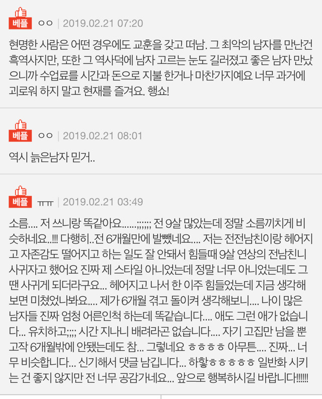 보통 사람들이 말하죠? 연애는 많이 해볼수록 좋다고. 근데 저 같은 저런 바보같은 짓을 하신다면 그건 그냥 연애에 끼워넣지도 마시고 얼른 헤어지세요... 아무리 연애경험이 중요하다지만 저런 사람은 경험이라기보단 상흔을 남기더군요. 저런 남자 만나느니 솔로로 사는게 낫죠...