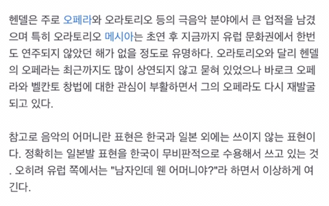 [흥미돋]음악의 아버지는 바흐 음악의 어머니는? 작성자김하도하여보|작성시간19.07.08|조회수3,613 목록 댓글 13 글자크기 작게가 글자크기 크게가 출처 : 여성시대, 김하도하여보는 헨델임 남자임 근데 일본이랑 같은 표현이라니 ㅠ 다음검색 현재 게시글 추가 기능 열기 북마크 공유하기 신고 센터로 신고 댓글 댓글 13 댓글쓰기 답글쓰기 댓글 리스트 작성자카카오파이 | 작성시간 19.07.08 엄마 아빠 둘다 남자가 느그마 그 왔다갔다 그거가 작성자내마음니어때 | 작성시간 19.07.08 칙칙폭폭..! 작성자양귀자 - 모순 | 작성시간 19.07.08 마 음악 니 엄마 아빠 남자끼리 얼레리 꼴레리 그거가 ㅋ 작성자옥키폭키 | 작성시간 19.07.08 남자를 왜 엄마라함? 작성자대은룡 | 작성시간 19.07.08 여성적 음악 이지랄로 어머니였던 거로 기억하는데ㅋㅋㅋ ㅗ 댓글 전체보기