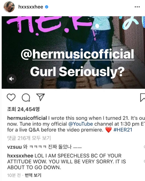 평소 허 팬으로 커버도 많이 하고 공연 많이 기달렸던 한서희도 실망해서 댓글 남겼는데 바로 블락 시켜벌임;;