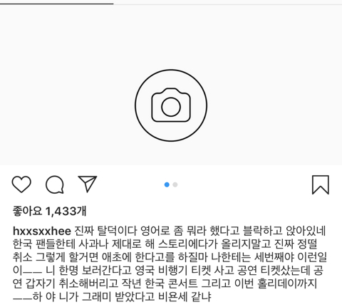 근데 웃긴건 지금 자기 인스타에 이로 인해 댓글 남기는 한국 팬들 댓글 삭제, 인스타 블락중^^..