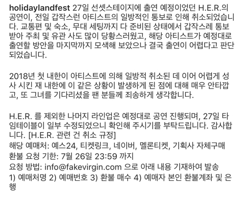 올해 그 것도 내일 홀리데이 랜드 페스티벌에 공연하기로 되어있었음 허 때문에 이 페스티벌 간다는 사람들도 많았고, 홀랜페 측에서도 허를 출연 시키는거에 대해 메인으로 세워서 홍보도 많이 했음 그 만큼 영향력 있다는 뜻