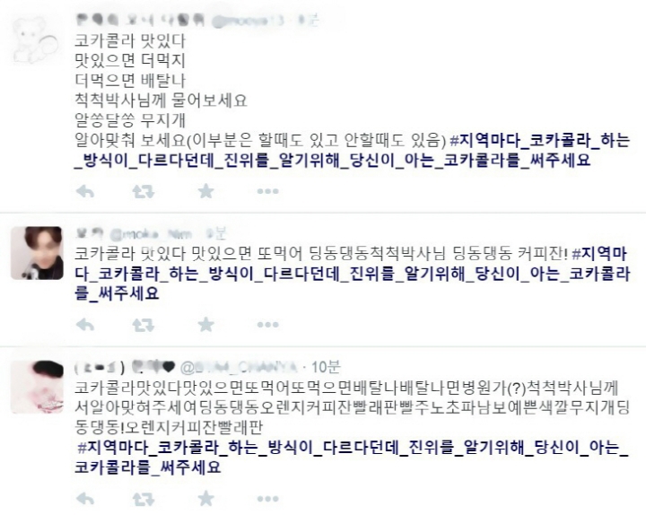 누리꾼들은 해시태그(#지역마다_코카콜라_하는_방식이_다르다던데_진위를_알기위해_당신이_아는_코카콜라를_써주세요)를 통해 지역별 가사를 공유하고 있다.