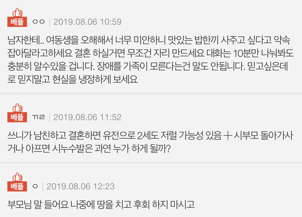 여동생 장애가 문제란 게 아니라 저게 사실이라면 속이고 말 안하는 저집안 사람들이 문제 -